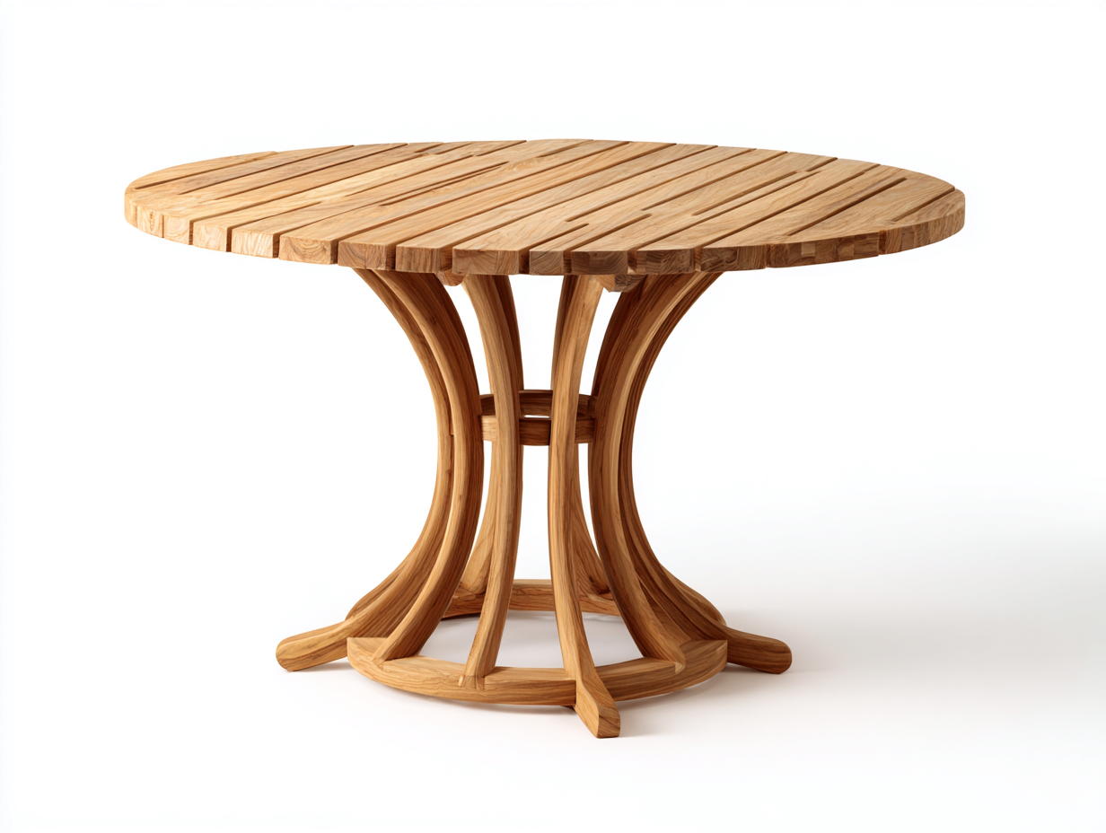The table is constructed from solid wood with a natural wood finish. The slatted tabletop supports outdoor use by allowing airflow and efficient drainage after moisture exposure.