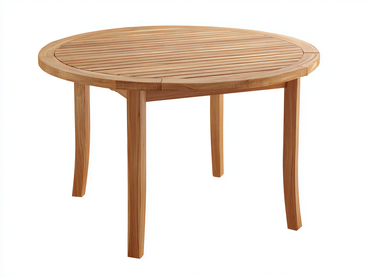 The table is crafted from solid wood with a natural wood finish. The slatted tabletop supports outdoor use by allowing airflow and quick drying after exposure to moisture.