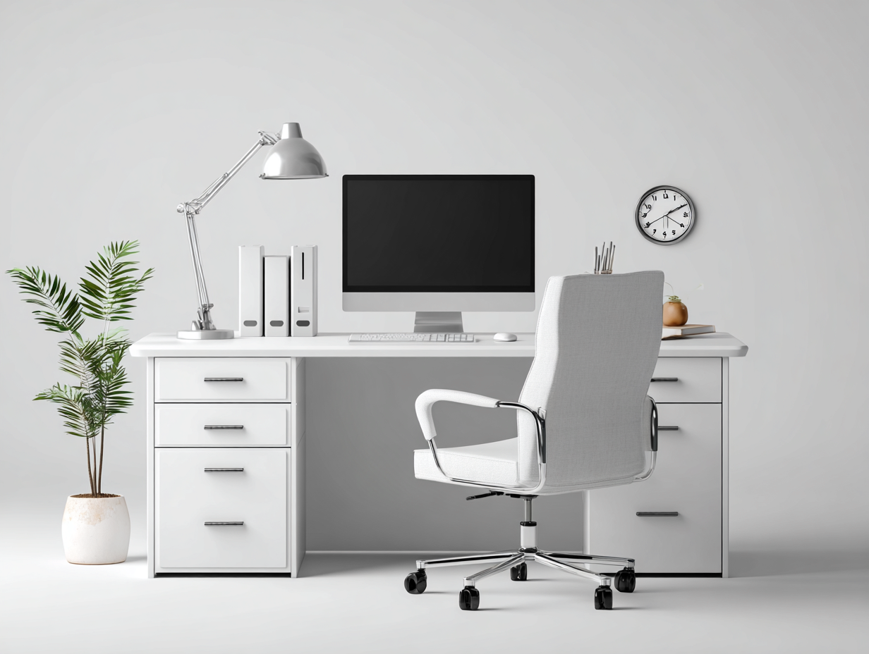 The desk is made from engineered wood with a smooth white finish. The surface is even and easy to maintain, while the stable structure supports everyday office use.