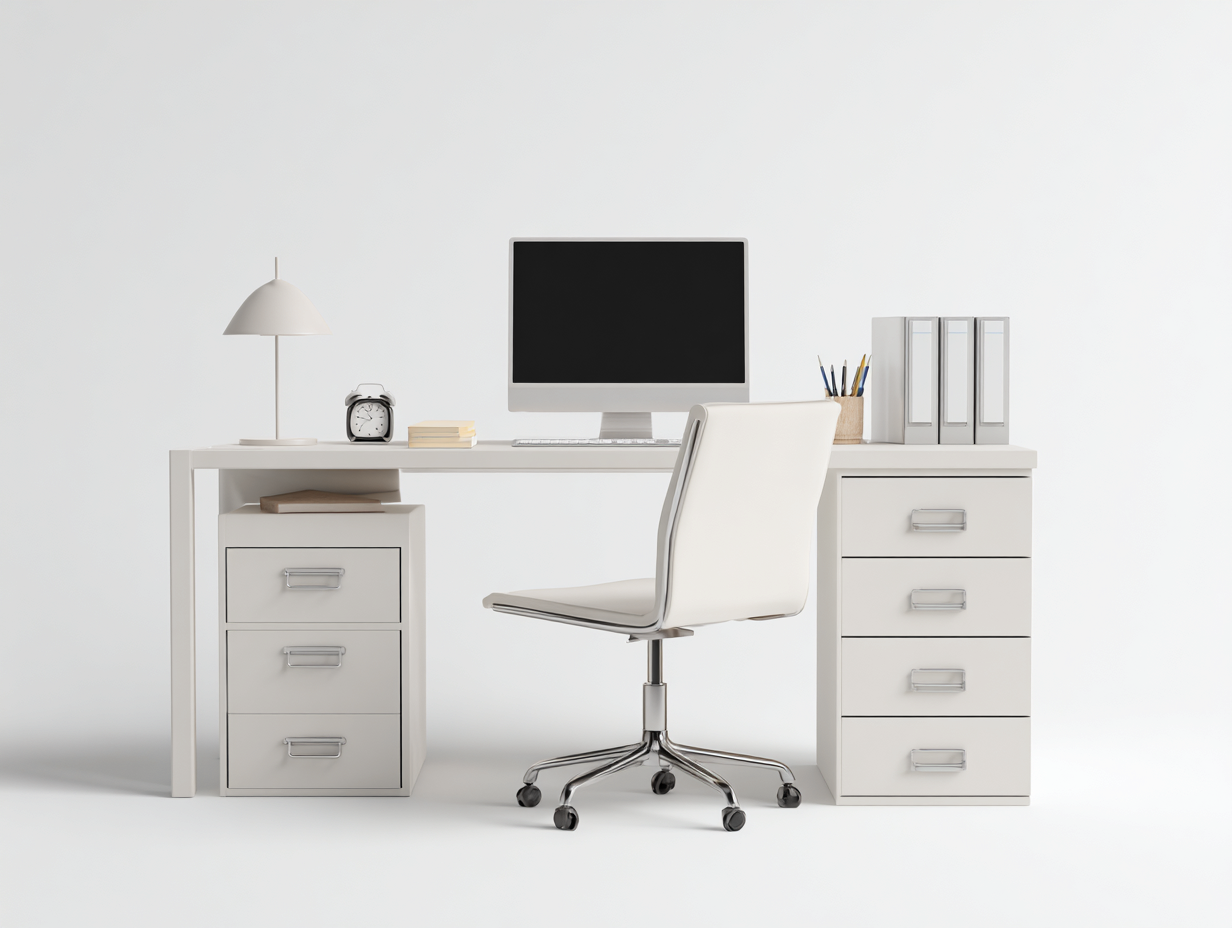 The wide desktop provides ample space for work tasks. Integrated drawer storage on both sides allows organised storage of documents and office supplies while keeping the desktop clear.